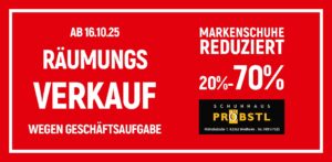 Nach vielen Jahren in Weilheim verabschiedet sich das Schuhhaus Pröbstl – und startet ab Mittwoch, 16. Oktober 2025, den großen Räumungsverkauf wegen Geschäftsaufgabe.